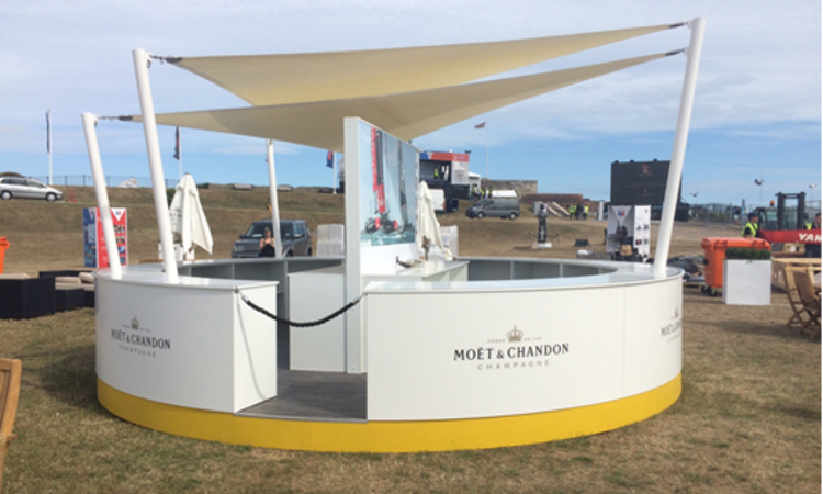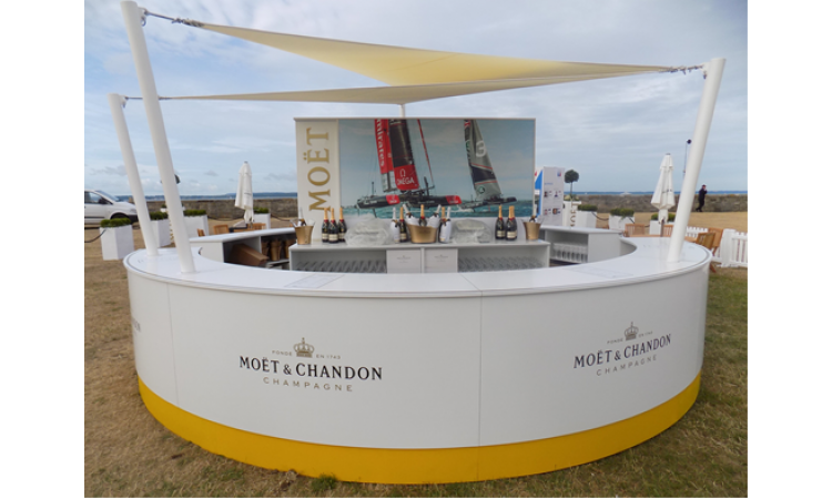 Fournir un moyen de sécuriser 5 colonnes inclinées pour un bar temporaire pour Moet & Chandon lors de l'événement America's Cup à Portsmouth. Le système d’ancrage devait être rapide à installer et à retirer. Ne laisser aucune trace après le retrait constitue un avantage car aucun temps de travail de rattrapage n'a été accordé.