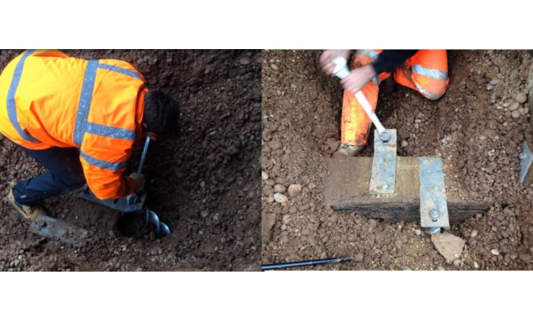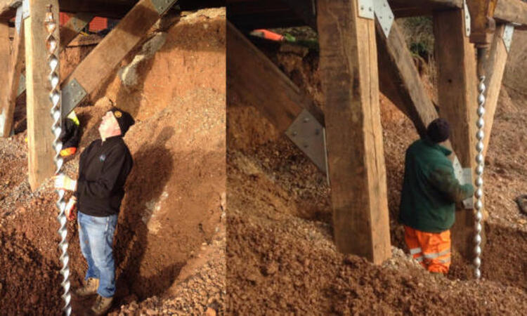 Nous avons utilisé des ancrages de 75 mm de diamètre et 2,8 m de long et en avons installé trois verticalement juste devant la poutre de support et trois autres à 45° passant par l'arrière de la poutre. Ceux-ci ont ensuite été fixés à la poutre à l’aide de supports fabriqués, de vis de réglage et de tire-fonds. Trois autres ancrages de 75 mm ont été utilisés pour épingler la face arrière du chalet afin d'empêcher tout mouvement latéral du bâtiment.